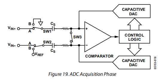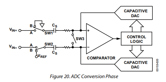 当ADC开始转换时(见图20),SW3打开,SW1和SW2移动到位置B,导致比较器变得不平衡。转换开始后,两个输入断开。控制逻辑和电荷再分配dac用于从采样电容阵列中添加和减去固定数量的电荷,以使比较器回到平衡状态。当比较器重新平衡时,转换完成。控制逻辑产生ADC输出代码。驱动VIN+和VIN-引脚的源的输出阻抗必须匹配;否则两个输入的稳定时间不同,会导致误差。