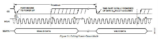 如前所述,当从断电模式通电时,部件在第一个SCLK边缘返回到跟踪模式在CS下降沿后使用。然而,当ADC在电源接通后开始通电时,跟踪保持已经处于跟踪模式。这意味着(假设有监控ADC电源电流的设备),如果ADC在所需的操作模式下通电,则无需假周期来改变模式。因此,也不需要假循环来放置轨道并保持在轨道上。