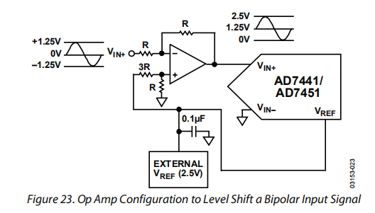 由于ADC是从单一电源供电,所以有必要对地面双极信号进行电平偏移,以满足输入要求。运算放大器(例如,AD8021)可以被配置成重新缩放和电平偏移地基(双极)信号,使其与AD7441/AD7451的输入范围兼容(参见图23)。