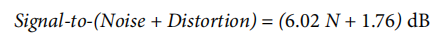 这是在ADC输出端测得的SINAD比率。信号是基波的均方根振幅。噪声是所有非基本信号的总和,不超过采样频率的一半(f/2),不包括直流电。该比率取决于数字化过程中量化层级的数量:层级越多,量化噪音越小。对于具有正弦波输入的理想N位转换器,理论SINAD比由: