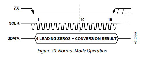 如果CS上升沿出现在16个SCLK之前,则转换终止,SDATA线路返回到3个状态。