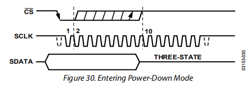 一旦CS在SCLKs窗口中处于高位,部件进入断电状态,CS下降沿启动的转换终止,SDATA返回到三个状态。从CS上升沿到SDATA三态启用的时间永远不大于t8(请参阅章节)。如果定时规格CS在第二个SCLK下降沿之前变高,则部件将保持在正常模式并且不会断电。这避免了由于CS线路故障而导致的意外断电。