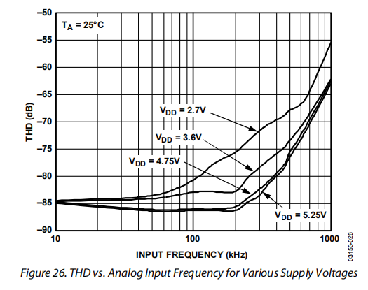 图26显示了不同电源电压下THD与模拟输入频率的关系图,而采样频率为1 MSPS,SCLK为18 MHz。在这种情况下,源阻抗为10Ω。