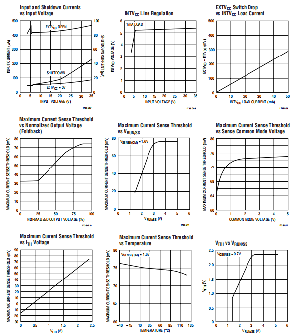 RUN/SS:软启动和运行控制的组合。电容器在这个引脚接地设置斜坡时间至全输出电流。时间约为1.25s/μF。将此引脚强制低于1.5V会导致设备关闭趴下。(有关静态信息,请参阅应用程序信息部分当前注释。)在关闭所有功能时,包括INTVCC,被禁用。Latchoff过电流保护也通过该引脚触发,如应用信息部分所述。