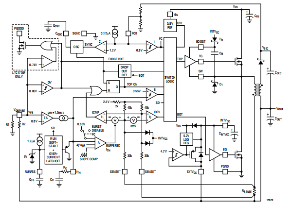 TG:用于顶部N沟道MOSFET的大电流栅极驱动。这是一个带有电压摆幅的浮动驱动器的输出等于叠加在开关节点电压上的INTVCC西南。