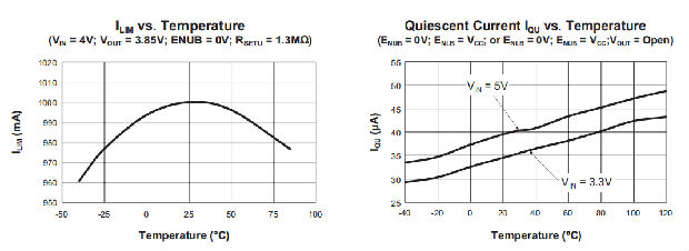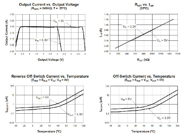 限流和超温电路独立工作。当输出负载电流超过内部阈值水平时,设备电流限制被激活。有两个独立启用的内部电流限制。每种情况下的电流限制阈值由连接在两个设置引脚和接地之间的外部电阻器确定。最小电流限制阈值由ILIM(MIN)指定。如果负载条件使器件保持在电流极限,芯片温度达到临界点,那么内部电源回路将把电流降低到安全水平。将ISETU连接到地面将禁用电流限制保护,允许低阻抗路径连接到主机VCC。