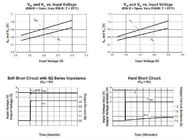 当输出端充电到输入电压的18mV以内时,串联功率MOSFET会完全关闭。在输出短路的情况下,这可以保护设备。在对输出施加短路或重负载后,导致输出下降到18mV阈值以下加上一些滞后,电流将立即尝试从零转换到最终编程值。只要输出为VIN 18mV或直到模具温度达到110oC,该设备将继续输出电流限制。如果温度发生回退,则电源回路将激活。