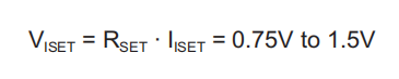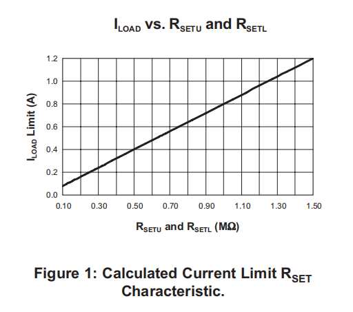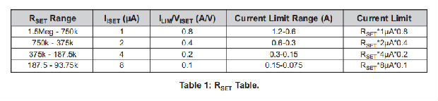 ISETL和ISETU节点在0.75V到1.5V的窗口内工作,电阻值在93.75Ω到1.5MΩ之间。不建议电阻值超出此范围。ISETL和ISETU源电流随表1中使用的电阻值而变化。要确定产生的电流限制,将RSETU或RSETL节点电压乘以表1中的增益。注意,节点处的电压在0.75V到1.5V之间变化,电流限制增益根据使用的电阻值而变化。