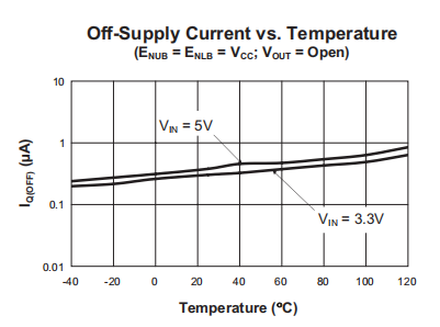 通过应用逻辑关闭负载开关两个EN引脚的高电平。当两者同时存在时选择了EN-IU将选择ISETU。EN功能具有逻辑电平阈值,允许AAT4621兼容TTL,也可以由2.5V至5.0V CMOS电路控制。施加在EN引脚上的电压电平不应超过VCC引脚上的输入电源电平。通常,当从T4 1输出的电流被阻止时,从T4 1输出的电流减少。