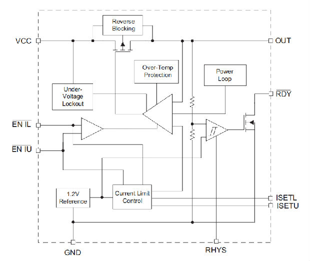 如果设定引脚开路或允许超过2V,则所有电源设备将被禁用,输入与输出断开。将set引脚短接至GND,可启用所有电源设备,并将VCC与输出引脚短路,无电流限制。