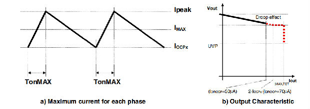 这意味着在过流情况下,由于电流纹波增加,平均电流也会略有增加。事实上,由于电流必须达到IOCPx底部,关断时间的上升会导致接通时间增加。最坏的情况是当接通时间达到最大值时。