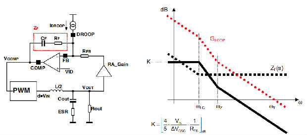 ACM控制回路增益被设计为获得高的直流增益以最小化静态误差,并以恒定的-20dB/dec斜率与期望的交叉频率ωT交叉0dB轴。忽略ZF(s)的影响,传递函数具有一个零极点和两个极点。设计输出滤波器后,两个极点都是固定的,零位由ESR和下垂电阻确定。
