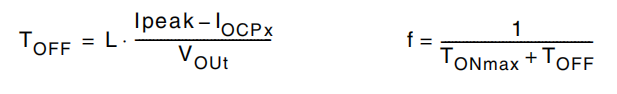 最大占空比被限制为测量电流的函数,由于振荡器频率在编程后是固定的,意味着最大接通时间限制如下(其中T是开关周期T=1/fSW,IOUT是输出电流):