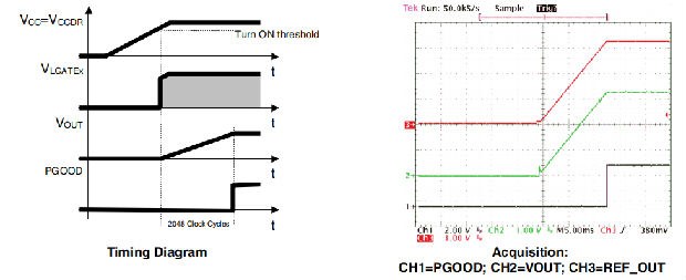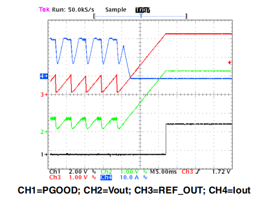 一旦软启动开始,参考值增加:上下MOSFET开始开关,输出电压开始随着闭环调节而增加。在数字软启动结束时,功率良好比较器被启用,然后PGOOD信号被高电平驱动(见图10)。