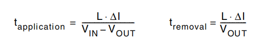 负载瞬态的响应时间因负载的应用或移除而不同:如果在负载施加过程中,电感器被等于输入和输出电压差的电压充电,则在移除过程中,仅由输出电压放电。以下表达式给出了补偿网络响应足够快时∆I负载瞬态的近似响应时间: