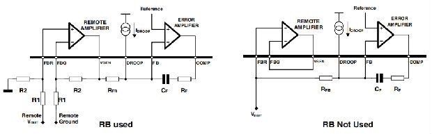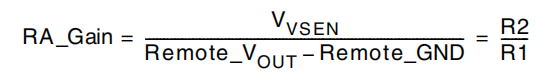 远程放大器:将外部电阻器放置在设备附近,以尽量减少噪声注入,并参考SGND。这些电阻器的连接(来自远程负载)必须作为并联网络进行布线,以补偿沿输出功率轨迹的损耗,并避免拾取任何噪声。将这些引脚连接在远离负载的点上会导致非最佳负载调节,增加输出公差。