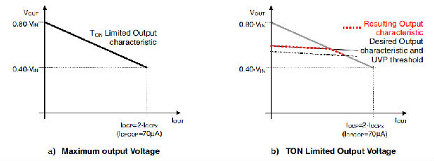 图5a显示了考虑到前一关系式施加的吨限制,装置能够调节的最大输出电压。如果期望的输出特性超过了最大输出电压,则输出电压在跨越后将开始下降。在这种情况下,该设备不执行恒流限制,而只根据先前的关系限制最大占空比。输出电压遵循产生的特性(如图5b所示),直到检测到UVP为止,或者直到IFB=70μA为止。