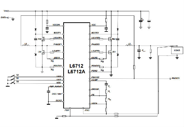 该器件是采用BCD技术实现的集成电路。它为高性能双相降压转换器提供完整的控制逻辑和保护,为大电流DC/DC应用优化。它被设计成一个两相同步整流buck拓扑中的N沟道mosfet。在两个相位之间提供180度的相移,允许减小输入电容器电流纹波,同时减小尺寸和损耗。转换器的输出电压可精确调节,可编程VID引脚,范围为0.900至3.300V,温度和线电压变化的最大公差为±0.9%。可编程遥控放大器避免了使用外部电阻分压器,允许恢复配电线路上的压降,还可以将输出电压调整到可用参考值的不同值。该装置提供了平均电流模式控制和快速瞬态响应。它包括一个150kHZ的自由运行振荡器,可通过电阻器进行外部调节。误差放大器具有15V/μs的转换速率,允许高转换器带宽以实现快速瞬态性能。电流信息是通过较低的mosfets RdsON或在全差分模式下串联到LS-mos的感测电阻器读取的。电流信息校正PWM输出,以均衡各相的平均电流。在静态和动态条件下,两相之间的电流共享被限制在±10%,除非考虑到传感元件的扩展。下垂效应可编程,以最小化输出滤波器和负载瞬态响应:该功能可被禁用,引脚上可用的电流信息可用于其他目的。该装置防止过电流,每相有一个OC阈值,进入恒流模式。由于电流是通过低边mosfet读出的,所以该器件使电感器底部的电流三角形波形保持恒定。当检测到欠压时,器件复位,所有mosfet关闭,然后突然重新启动。该设备还执行一个撬杆过电压保护,立即锁定操作打开较低驱动器和驱动高故障引脚。
