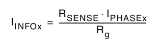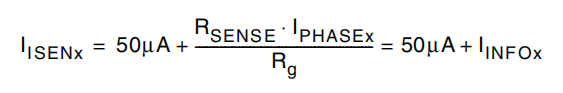 其中,RSENSE是一个外部感测电阻或低端mosfet的RdsON,Rg是在ISENx和PGNDSx引脚之间朝向读数点使用的跨导电阻;IPHASEx是相对相位携带的电流。内部重现的当前信息由上一等式的第二项表示,如下所示: