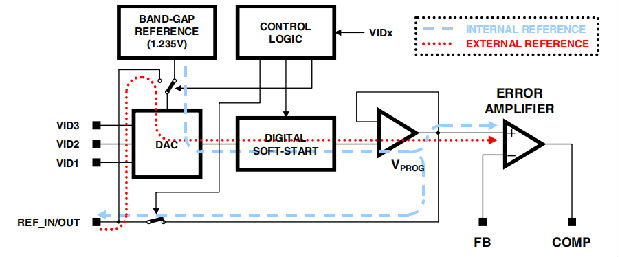 该装置提供一个双向引脚REF_IN/OUT:用于调节的内部基准通常在该引脚上可用,具有3mA的最大电流容量,但当编程VID代码111时除外;在这种情况下,设备通过REF_IN/OUT引脚接受外部参考并对其进行调节。当使用外部基准时,其范围必须从0.800V到3.300V,以确保设备的正常功能。