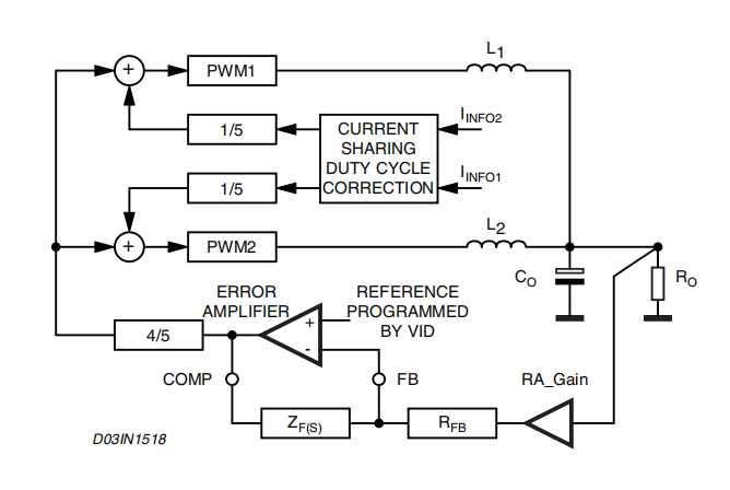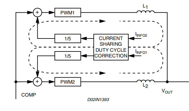 由于电流是在差分模式下读取的,因此负电流信息也会被保留;这允许设备检查两相之间的危险回流电流,确保相位电流之间的完全均衡。根据各相的电流信息,取所输送的总电流(IFB=IINFO1+IINFO2)和各相的平均电流(IAVG=(IINFO1+IINFO2)/2)。然后将IINFOX与IAVG进行比较,以对PWM输出进行校正,以均衡两相携带的电流。