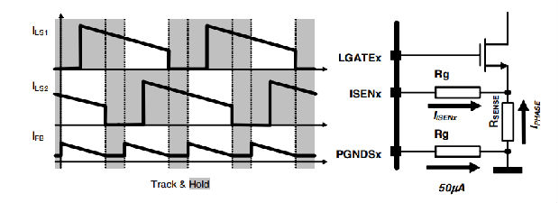 通过低侧mosfets RdsON或串联到LS-mosfet的感测电阻(RSENSE)的电压降来读取流过每相的电流,并在内部转换成电流。跨导比是由芯片外部放置在ISENx和PGNDSx引脚之间朝向读取点的外部电阻器Rg发出的。差动电流读数可抑制噪声,并允许在不影响测量精度的情况下将传感元件放置在不同的位置。电流读取电路在低侧mosfet开启(关闭时间)期间读取电流。在此期间,反应使引脚ISENx和PGNDSx保持在相同的电压,而在读取电路关闭的时间内,内部钳位使这两个引脚保持在相同的电压,从ISENx引脚下沉所需的电流(如果实施低侧mosfet RdsON sense,以避免绝对最大额定值克服on,则需要)ISENx引脚)。