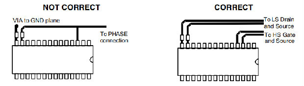 此外,当使用低侧mosfet RdsON作为电流检测元件时,ISENx引脚实际上连接到PHASEx引脚。不要将针脚连接在一起,然后再连接到HS来源!由于高压侧驱动器返回时产生的噪音,设备无法正常工作。在这种情况下,布线两个独立的网络:将PHASEx引脚连接到带有宽网(30 mils)的HS源(与HGATEx一起布线),将ISENx引脚连接到LS漏极(与PGNDSx一起布线)。此外,PGNDSx引脚始终通过Rg电阻器连接到PGND:请勿直接连接到PGND!在这种情况下,设备将无法正常工作。无论如何都要路由到LS mosfet源(与ISENx网络一起)。