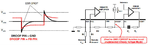 系统控制回路拓扑取决于下垂引脚连接:如果连接到FB(降速功能激活),则必须考虑平均电流模式拓扑,而如果连接到GND(下垂功能未激活),则必须考虑电压模式拓扑。