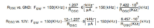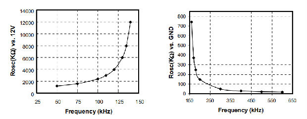 内部振荡器通过内部电容器产生用于PWM充放电的三角形波形。传送到振荡器的电流通常为25μA(Fsw=150kHZ),并且可以使用连接在OSC引脚和SGND或Vcc之间的外部电阻器(ROSC)来改变。因为OSC引脚保持在固定电压(典型。1.237V),考虑到6KHz/μA的内部增益,频率与从引脚(压入)的电流成比例变化。