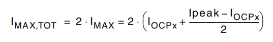 最大占空比是固定的,并且与所输送的电流保持恒定。一旦克服了OCP阈值,该器件将以恒流运行。参考上述恒流部分,其中仅需考虑最大负载下的不同值,如下所示: