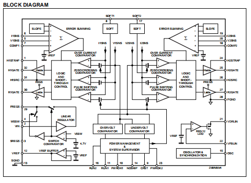 芯片通过引脚Vin(2)供电,通常由电池组或AC-DC适配器的输出提供,并且电压范围从5V到25V。设备的偏置电流返回信号接地引脚SGND(13) ,它引用内部逻辑电路。外部MOSFET的驱动器有其单独的电流返回,即电源接地引脚PGND(28)。注意保持信号机接地线路的隔离和电源接地管脚(参见“布局和接地”一节)。两个PWM调节器共用内部振荡器,可编程或通过引脚OSC(15)同步。