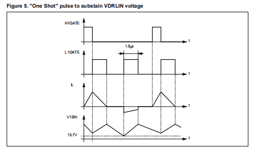 为了使调节器正常工作,针脚VDRLIN处的电压不得过低。反激连接如果有良好的磁耦合,两个绕组中的一个可确保电压调节良好。耦合的但是,如果主输出负载较轻,则电感器配置无法维持辅助电压:二次电压下降,系统失去调节。如果相关部分的负载足够大,则可使用L5994实现附加绕组。为了克服这个问题,在L5994A中,当VDRLIN电压低于某个阈值(13.7V±5%)时由于段2上的负载太轻,相关同步整流器在电感器电流为零的间隔(“一次触发”特性,参见图6)。这样,电感器电流将正向传输到辅助输出的输出电容器能量反向并吸取。如果线性驱动器不需要由线性驱动器提供,则由线性驱动器提供,保持浮动此引脚意味着线性驱动器未提供,因此不会浪费电源(仅限L5994)。如果两个runx信号中至少有一个被断言,则线性调节器激活