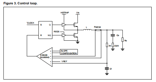 控制回路不采用传统的误差放大器,而是采用误差相加比较器求出参考电压、反馈信号、通过外部感测电阻的电压降和斜率补偿斜坡(以避免占空比大于50%的次谐波振荡)标志。参考图3的示意图,两个控制器的输出锁存器由来自振荡器。这会关闭低侧MOSFET(同步整流器),当低侧栅电压降到0.3V以下以防止交叉传导,打开高压侧,从而允许从输入源和存储在电感器中。通过比较上述信号,误差求和确定输出时刻闩锁要复位。高压侧MOSFET关闭,同步整流器在高压侧MOSFET源上的电压降到2V以下以防止交叉传导,从而使in 导管电流再循环。在任何情况下,高侧mosfet在时钟信号下降沿关闭:这是关税限制在其最大价值的原因。达到的状态保持到下一个振荡器脉冲。在理想斜率补偿假设下,这种控制系统的开环传递函数为: