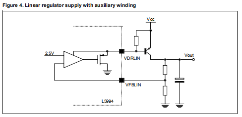 如果带辅助绕组的部分在满负荷下工作,而线性调节器是轻负荷的,则引脚VDRLIN处的电压可能超过预期值。事实上,DS和CS充当峰值保持电路VDRLIN受开关瞬态电压尖峰的影响。内部钳位限制VDRLIN引脚的最大值为16V,但是,在干预的情况下,芯片的功耗将起来。那个只要芯片上有PREG5和VREF,线性驱动器就始终处于活动状态(参见相关章节);它工作的目的是在VFBLIN引脚上获得大约2.5V的电压。这样,最小调节电压为2.5V,直接将VFBLIN引脚连接至输出,而最大值约为电源电压减去双极PNP VceSAT。