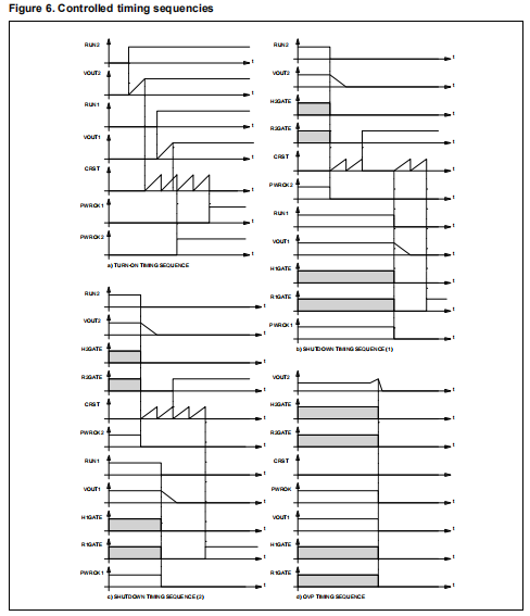 该装置配有一些控制销,适用于执行一些常用功能或有时在电池供电的设备中需要。此外,它的特点是控制时序,以防开启/关闭和设备关闭,在任何情况下都能安全可靠地运行。如上所述,RUN1和RUN2引脚允许通过逻辑分别禁用两个PWM转换器如前所述,信号(可能来自μP)。NOSKIP可以禁用脉冲跳过功能:当它保持在高位时,两个PWM调节器都不允许进入这种操作。当相对PWM调节器输出时,两个PWROKx信号(每个部分一个)立即驱动低电平低于其自身的欠压(轻或硬)阈值或当其被禁用时。当相对调节器正常运行时,该值为高。连接在CRST和地面之间的电容器以1.5msec/nF的顺序固定一个时间,延迟PWROKx的过渡低-高。这发生在每段启动时或恢复欠压后使用相对RUNx命令的条件。延迟从输出电压达到正确值。在另一种情况下,同样的延迟也会介入:当一个区段被禁用时(因为它的RUNx低驱动或由于热关机),相关的同步整流器在上述延迟之后被打开以确保不再供应负载。然而,在过电压的情况下,这种延迟不起作用:同步整流器立即转动开机后关机,从而起到内置“撬棍”的作用。所有这些定时序列在图7中示出。