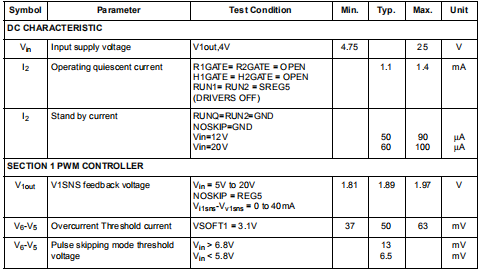 fPS的单位是赫兹。因此,由于开关和栅极驱动造成的损耗考虑到低输出功率下的功耗,都大大降低了。1段可以在输入电压非常接近输出电压的情况下工作(即输出电压为5V),其中电流波形可以是平坦的,以防止脉冲跳变被激活。为了避免这种情况,在低输入电压(VIN<6.8V)下,脉冲跳过阈值(仅第1节)大约减半。在这种情况下,在上述公式中,常数K变为12.8×103。脉冲跳频时,输出电压比PWM方式高出约10mv,这是由于它的工作模式操作的。如果由于任何原因这种“负载调节”效果不理想,则可能会禁用脉冲跳过功能(参见“电源管理”部分),从而降低轻负载下的效率。