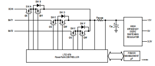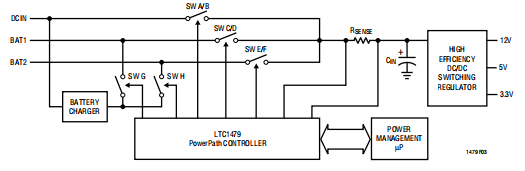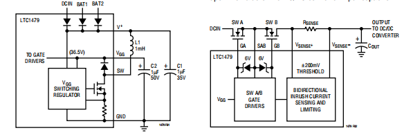 LTC1479负责在电源管理系统的“前端”在哪里两个电池组和一个直流电源不加区分地连接和断开。平滑完成输入电源之间的切换在低损耗N通道开关的帮助下限制浪涌电流的特殊门驱动电路电池组和系统电源的进出提供电容器。