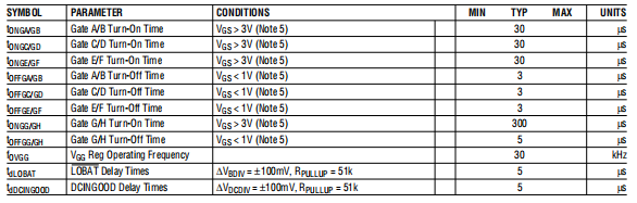 注5:在无涌流的情况下测量闸门开启和关闭时间限流,即VSENSE=0V,在典型的应用电路。