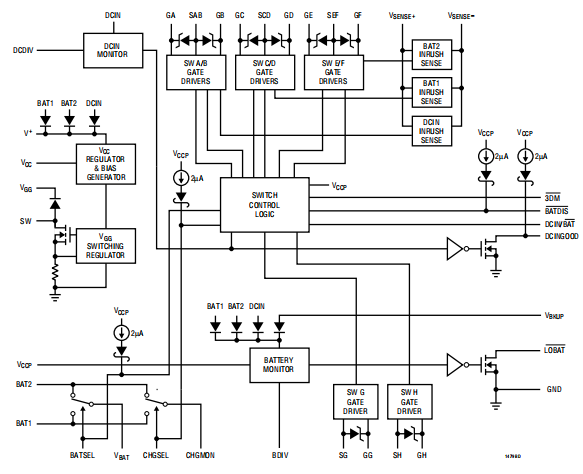 GG,GH(引脚29、27):充电器开关门驱动。这些两个引脚驱动背靠背N通道的栅极充电器输出之间的开关对,SW G和SW H还有两个电池。