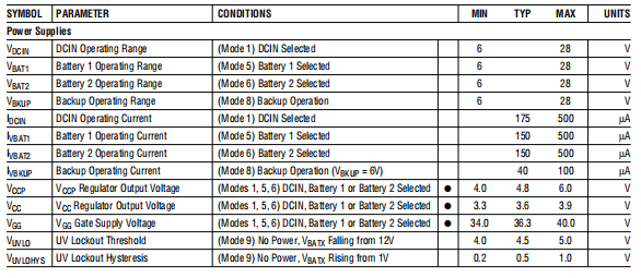 除非另有说明,否则VDCIN=25V,VBAT1=16V,VBAT2=12V,TA=25oC。(注2)