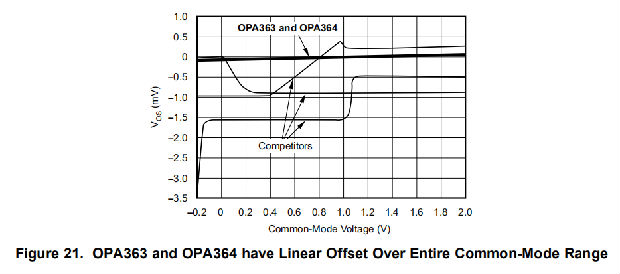 OPA363和OPA364系列提供了出色的CMRR,而没有与传统的免费输入阶段相关的交叉。这使得在驱动模数转换器时具有良好的性能,而不会降低微分线性度和THD。输入共模范围包括正负电源。输出电压摆幅在钢轨10mV范围内。