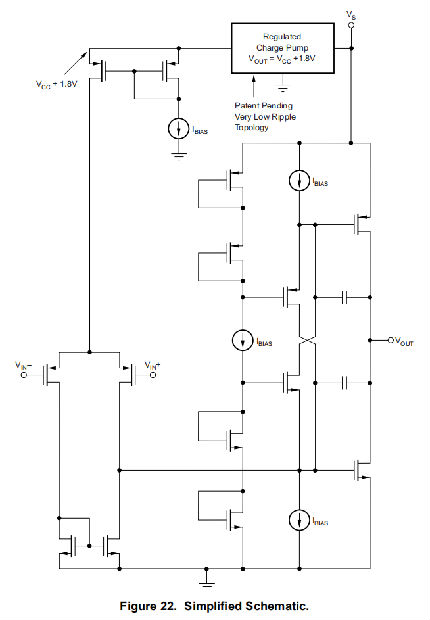 OPA363和OPA364具有良好的轨对轨运行特性,电源电压低至±0.9V。OPA363和OPA364系列的输入共模电压范围超出电源轨100mV。OPA363和OPA364的独特输入拓扑消除了大多数railto-rail互补级运算放大器的典型输入偏移过渡区,允许OPA363和OPA364在整个共模输入范围内提供优异的共模性能,如图21所示。此特性可防止驱动A/D转换器时差分线性误差和THD的退化。图22显示了OPA363和OPA364的简化示意图。