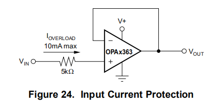 所有OPA363和OPA364引脚均采用内部ESD保护二极管进行静电保护。如绝对最大额定值所述,如图24所示,如果电流外部限制在10mA,这些二极管将提供过驱动保护。