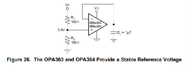 许多单电源应用需要中间电源参考电压。OPA363和OPA364具有出色的电容负载驱动能力,可配置为提供0.9V参考电压,如图26所示。有关适当的负载注意事项,请参阅电容性负载部分。