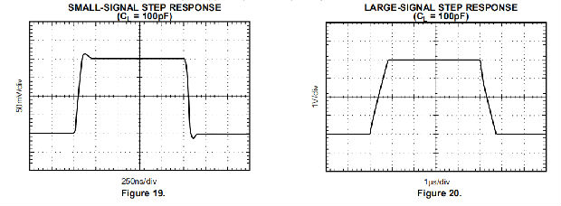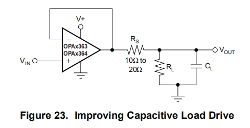 在单位增益配置中,改进电容负载驱动的一种方法是在输出端串联一个10Ω到20Ω的电阻器,如图23所示。这大大减少了大电容负载时的响铃。然而,如果有一个电阻负载与电容负载并联,它会产生一个分压器,在输出端引入直流误差,并略微降低输出摆幅。这个错误可能无关紧要。例如,当RL=10kΩ,RS=20Ω时,输出误差仅为0.2%。