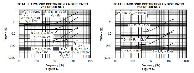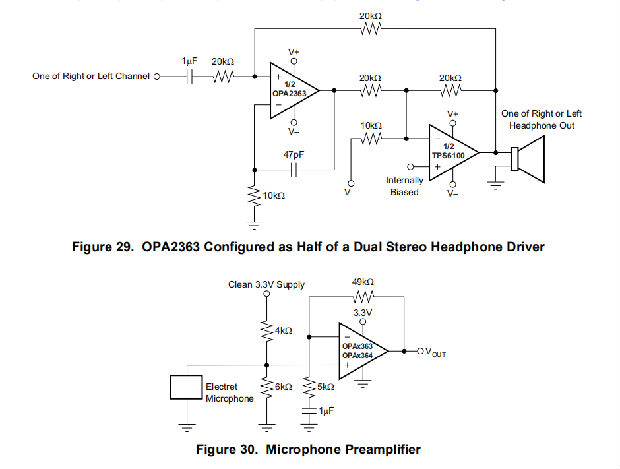 OPA363和OPA364运算放大器系列在整个输入共模范围内具有线性偏置电压。结合低噪音,这一功能使OPA363和OPA364适合音频应用。单电源1.8V操作允许OPA2363和OPA2364成为便携式立体声设备中双立体声耳机驱动器和麦克风前置放大器的最佳候选,见图29和图30。