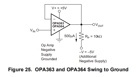 OPA363或OPA364的输出可以在一个电源上摆动到地面,或略低于地面。要做到这一点,需要使用另一个电阻和一个比运算放大器的负电源更多的负电源。可以在输出端和附加的负电源之间连接一个下拉电阻,将输出端拉低到输出值以下,如图25所示。