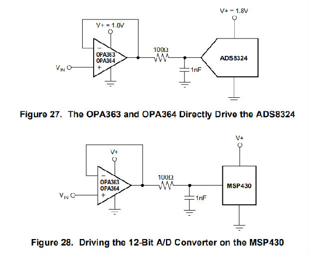 OPA363和OPA364系列运算放大器优化用于驱动中速(高达100kHz)采样A/D转换器。然而,它们也为高速变频器提供了优异的性能。OPA363和OPA364的无交叉输入级直接驱动A/D转换器,不会降低差分线性度和THD。它们提供了一种有效的方法来缓冲A/D转换器的输入电容和由此产生的电荷注入,同时提供信号增益。图27和图28显示了配置为驱动MSP430上的ADS8324和12位A/D转换器的OPA363和OPA364。