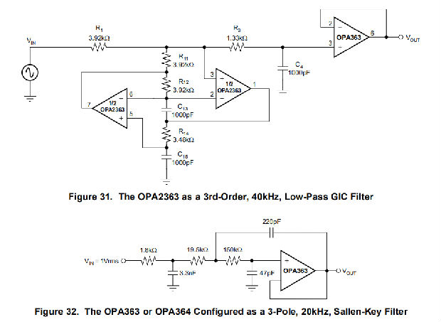 低谐波失真和噪声规范,加上高增益和转换率,使OPA363和OPA364成为有源滤波的最佳候选。图31显示了配置为低失真、三阶GIC(通用导抗转换器)滤波器的OPA2363。图32显示了Sallen-Key,三极,低通贝塞尔滤波器的实现。
