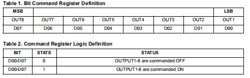 输入字节(8位)被路由到命令寄存器。表中给出了该命令寄存器的内容1和表2。附加的DI数据将继续缠绕在DO管脚上。如果CS在接收完当前字节后,这个刚刚发送的字节将被忽略